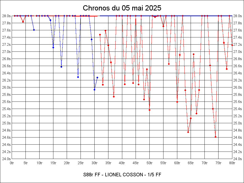 Meilleur tour - 24.613 05-05-2025 17:29:20 18.99°C 27.69°C 0.28km 40.95km/h
