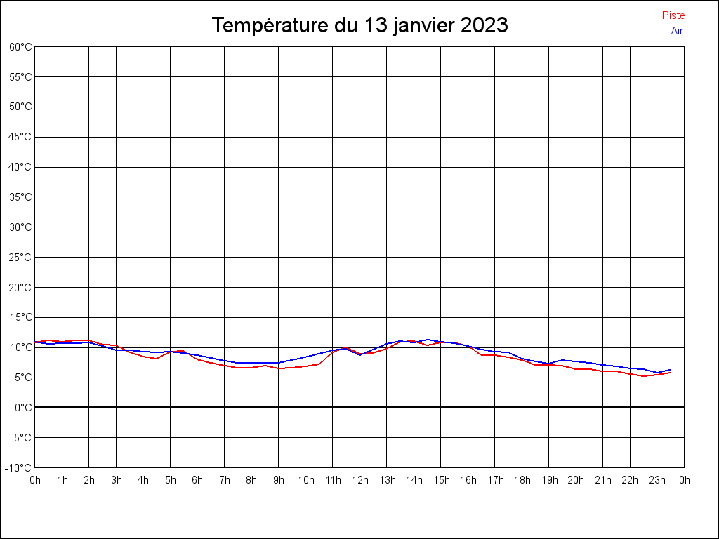 Le 13/01/2023 à 16:23:22, il faisait 9.75°C dans l'air et 8.75°C au sol.
